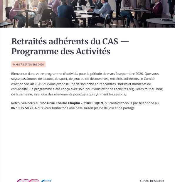 Chers adhérents retraités, Le CAS vous invite à une rentrée pleine d’activités, de rencontres et de bonne humeur !De septembre à janvier, on vous propose un cocktail vitaminé de sorties, jeux, sport et papotages… à consommer sans modération ! Pour… Lire la suite »Programme Retraités