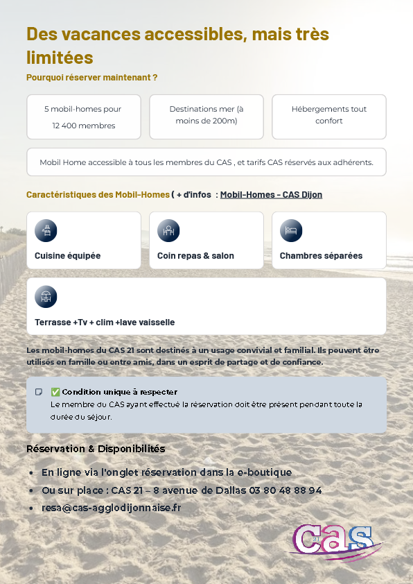 Dans le cadre de ses activités, le CAS 21 propose à la location des mobil-homes dédiés exclusivement aux bénéficiaires de notre Comité d’Action Sociale. Ces mobil-homes sont disponibles de mi-mars à mi-octobre, offrant ainsi une opportunité idéale pour des vacances en famille ou entre amis.
