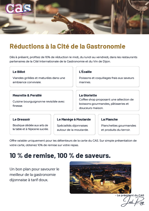 Aux portes de notre patrimoine, découvrez l’art sous toutes ses formes grâce aux activités culturelles proposées par le CAS. Nous vous invitons à explorer la richesse culturelle de notre région et au-delà, à travers des activités enrichissantes et diversifiées. Profitez de visites guidées de villages régionaux, de cours de peinture, et de la découverte des archives municipales, et de l’accès à la cité de la gastronomie grâce à nos pass annuels.